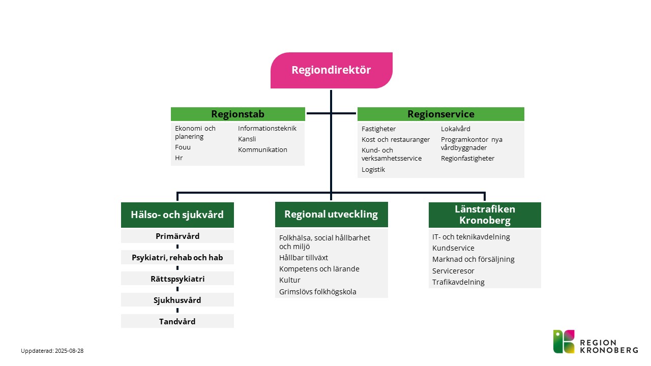 Region Kronoberg är indelad i tre olika förvaltningar: hälso- och sjukvård, regional utveckling och trafik. Förvaltningarna ska ta fram underlag för politiska beslut och se till att de blir verklighet.