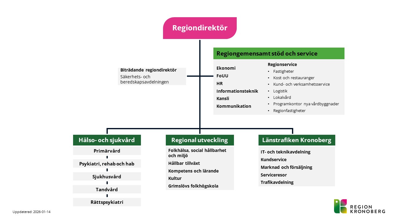 Region Kronoberg är indelad i tre olika förvaltningar: hälso- och sjukvård, regional utveckling och trafik. Förvaltningarna ska ta fram underlag för politiska beslut och se till att de blir verklighet.