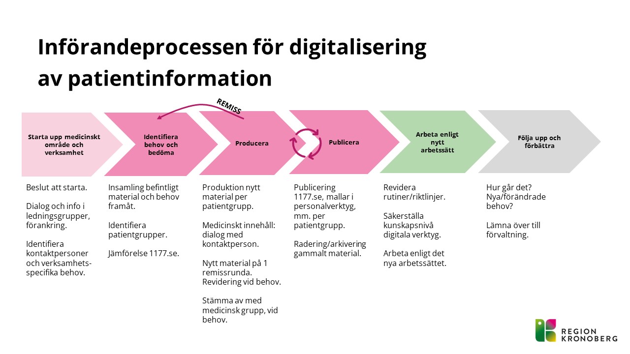 Grundprincipen i Region Kronoberg är ”digitalt först – på papper när det behövs”. Det betyder att patientinformationen i första hand ska delas digitalt via 1177.se, eftersom det är den mest tillgängliga, uppdaterade och kvalitetssäkrade källan. Om papper behövs kan personalen skriva ut informationen på 1177.se och ge direkt till patient eller skicka länken via 1177 personalverktyget.