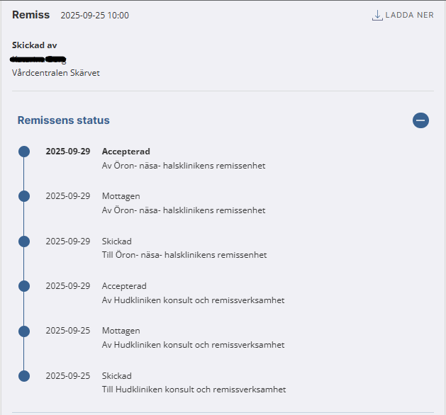 En pågående remiss som skickats till och mottagits av hudkliniken. Remissen är accepterad och därefter vidarebefordrad till öron-näsa- halskliniken som accepterat remissen.